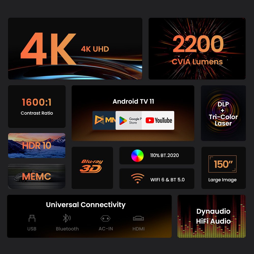 | Display | Brightness: 2200 CVIA Lumens Resolution: 4K UHD Image Size: 150” Display Technology: DLP Display Chip: TI 0.47'' DMD Light Source: Triple-Color Laser Lamp Life: 30000 Hours Contrast Ratio: 1600:1 Color Gamut: 110% BT.2020 Color Accuracy: ΔE <1 HDR: HDR 10 Laser Speckle Reduction Rate: >96% Brightness Uniformity: >95% Color Depth: 10-bit Color Depth (1.07 Billion Colors) Zooming: Digital Zoom 3D Support: Local 3D sources only, including Blu-ray 3D MEMC: Yes |